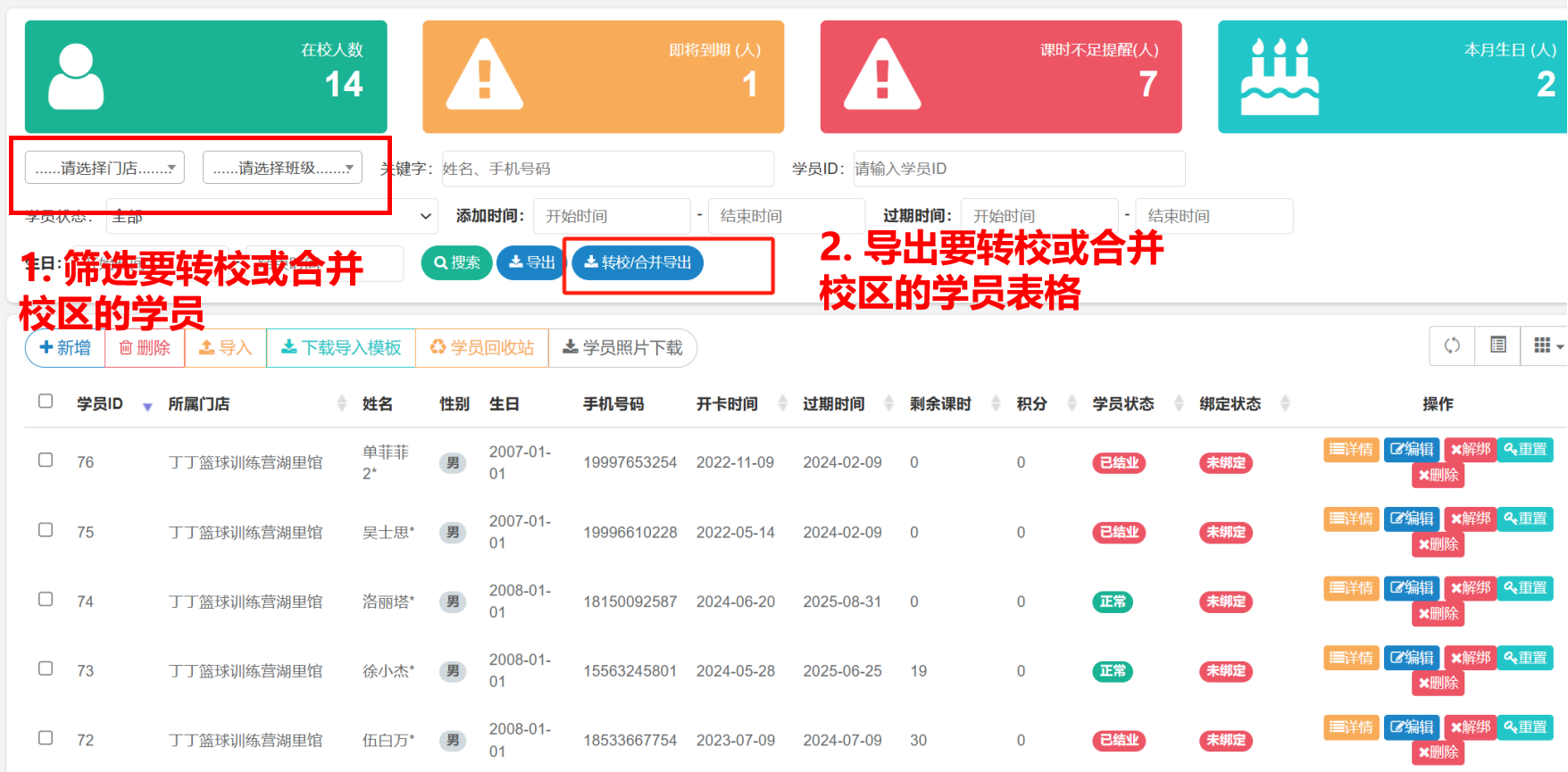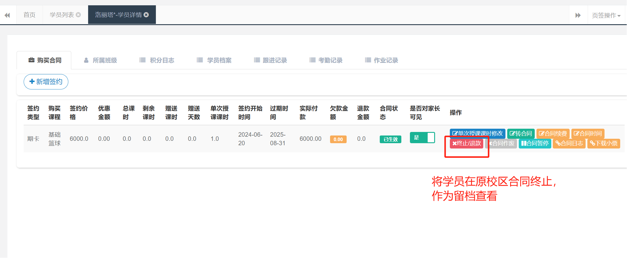 目录 搜索 微信公众号操作指南1.微信公众号服务号注册流程2.公众号授权塔课运动管理系统APP塔课管理系统操作说明(Take 智能教育)APP 操作指南(原Tatapunch 横版)塔课 后台管理系统后台系统操作指南作业布置操作指南家庭端用户操作指南tata-punch 少年版APP塔课学员小程序系统疑难解答体测操作指南拼团操作指南转校/合并校区操作指南考级系统操作指南 暂无相关搜索结果! 本文档使用 MinDoc 发布 转校/合并校区操作指南 教务管理—学员管理—学员列表 下载“转校/合并导出”表格操作表格内容修改好后,再导入到【学员李彪 终止学员原合同文档更新时间: 2025-02-25 11:38 作者:admin